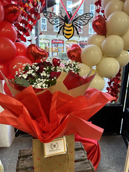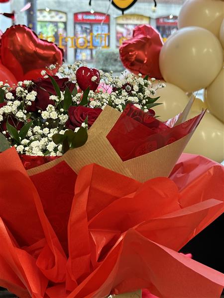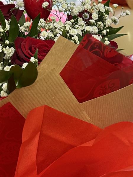 6 red roses and gypsophila with mixed foliage in a bouquet bag