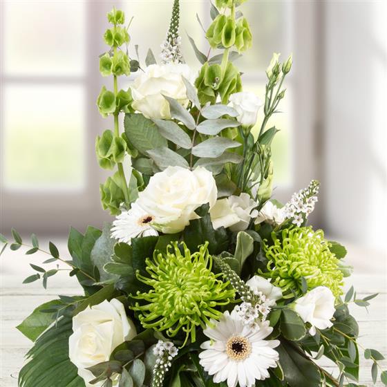 A stunning, simple and contemporary cube arrangement in whites and limes, including molucella, shamrock blooms and roses.