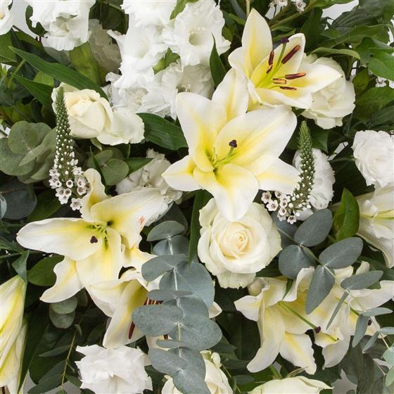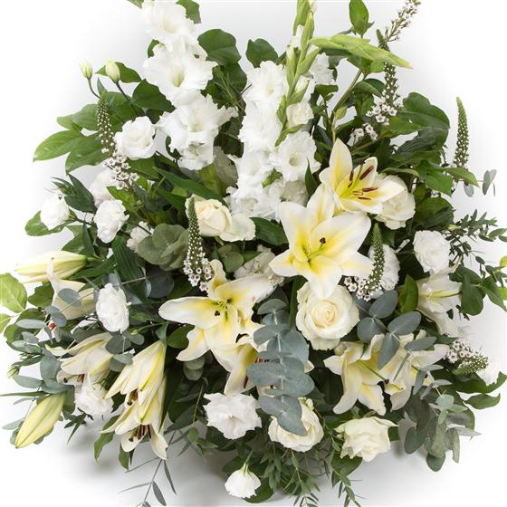 An all white triangular arrangement measuring 24"(61cm) in height and 20"(51cm) in width, including scented oriental lilies, roses and gladioli.
