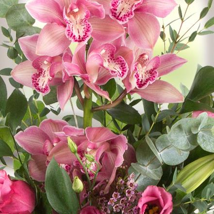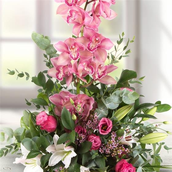 A spectacular cymbidium orchid arrangement with scented lilies, roses and delicate foliage.