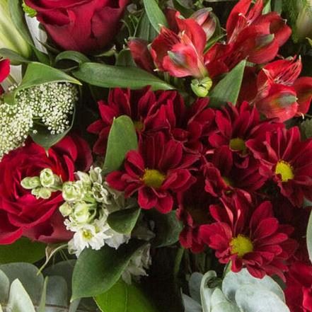 An seasonal collection including red roses, oriental lilies with a variety of red and lime blooms and foliage.